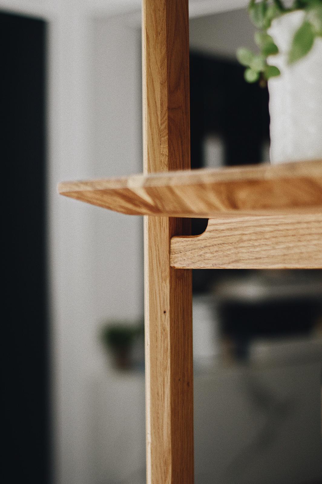 Open shelving is not only an efficient way to sort, display, and store objects, but it can also effortlessly divide a room. In this particular case, the ceiling height gave us enough space horizontally to properly build a compelling visual story.